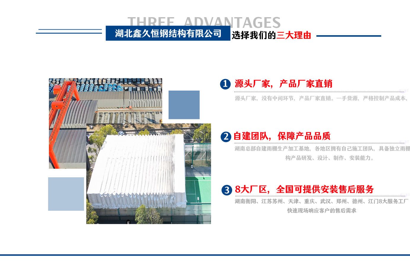 湖北鑫久恒鋼結(jié)構(gòu)有限公司是一家電動(dòng)雨棚、膜結(jié)構(gòu)車棚研發(fā),生產(chǎn)銷售,施工安裝于一體的專業(yè)鋼結(jié)構(gòu)科技公司,主要產(chǎn)品有伸縮雨棚,電動(dòng)雨棚,膜結(jié)構(gòu)車棚等。 湖南地區(qū)職員目前有80多人,占地面積20000平方米,廠房面積15600平方米,配備先進(jìn)的生產(chǎn)流水線,使每件品質(zhì)產(chǎn)品的堅(jiān)實(shí)基礎(chǔ)。 公司在蘇州、天津、重慶、武漢、德州、烏魯木齊、江門均設(shè)有服務(wù)工廠,總?cè)藛T共300多人,擁有專業(yè)的技術(shù)團(tuán)隊(duì),配備先進(jìn)的設(shè)備和流水線生產(chǎn),產(chǎn)能高,貨源充足,發(fā)貨速度快,服務(wù)區(qū)域廣。 移動(dòng)伸縮棚適用于通道臨時(shí)倉儲(chǔ)、戶外運(yùn)動(dòng)遮陽、污水池遮蓋、能源交通、熱力化工、礦山、船舶制造及市政建設(shè)、物流、碼頭等領(lǐng)域的構(gòu)件制作加工,成品半成品存放、倉庫、野外儀器設(shè)備操作用房等。尤其是對工廠發(fā)貨、倉儲(chǔ)臨時(shí)遮雨防嗮,梅雨期較長、建設(shè)周期較短的工程施工等特別適用。還可根據(jù)用戶需求量身定制、適合企業(yè)所需不同款式的產(chǎn)品。 我公司堅(jiān)持“誠信社會(huì)為本,客戶滿意為榮”的經(jīng)營理念,做到質(zhì)量把控,嚴(yán)格管理,精益求精,恪守承諾。使鑫久恒逐步走向成熟,其系統(tǒng)化、專業(yè)化日趨完善。以專業(yè)的技術(shù)、科學(xué)的管理,更高的產(chǎn)品質(zhì)量,優(yōu)良的企業(yè)信譽(yù),真誠的客戶服務(wù),靈活多樣的經(jīng)營方式和務(wù)實(shí)創(chuàng)新的企業(yè)精神愿與社會(huì)各界攜手合作,為推動(dòng)智能鋼結(jié)構(gòu)建筑事業(yè)的發(fā)展而不斷努力。...